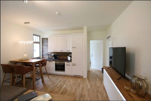 Das Appartement für 3 Personen hat ebenfalls eine kleine, voll eingerichtete Küche, kleine Sitzecke sowie ein Bad mit ebenerdigem Duscheingang - Bei Belegung mit 3 Personen wir ein vollwertiges und komfortables Bett mit in das Zimmer gestellt.